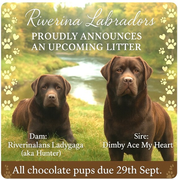 Dam: Riverinalabs Ladygaga — a beautiful chocolate girl with a sweet, loyal temperament and strong maternal instincts. She is an affectionate companion with a calm nature, making her an excellent foundation for this litter.